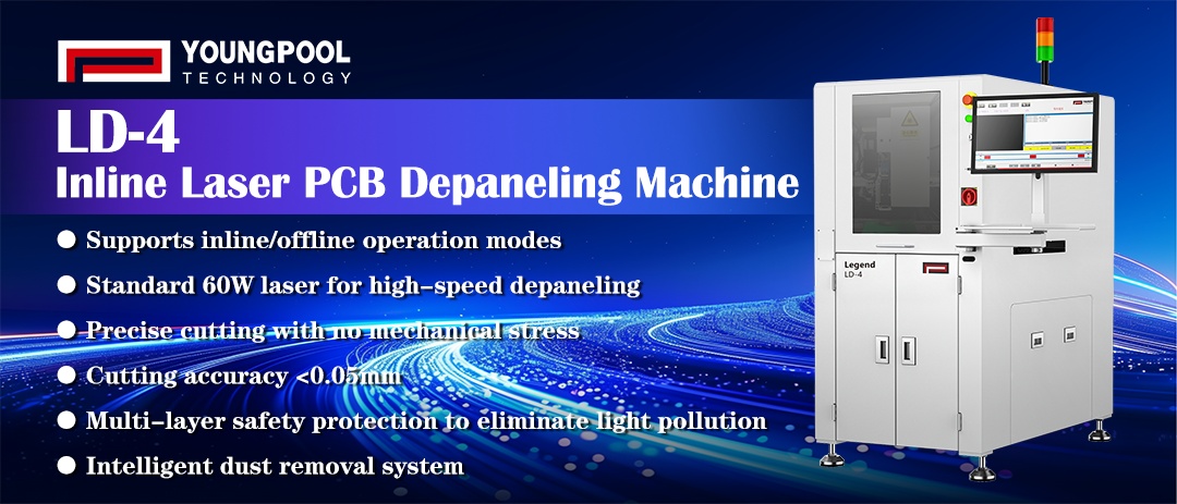 • LD-4 Inline Laser PCB Depaneling Machine: Utilizing UV cold light source technology, it achieves precision cutting with zero mechanical stress and no thermal impact, providing an ultimate depaneling solution for fragile PCB assemblies such as Mini LED and high-end automotive modules.