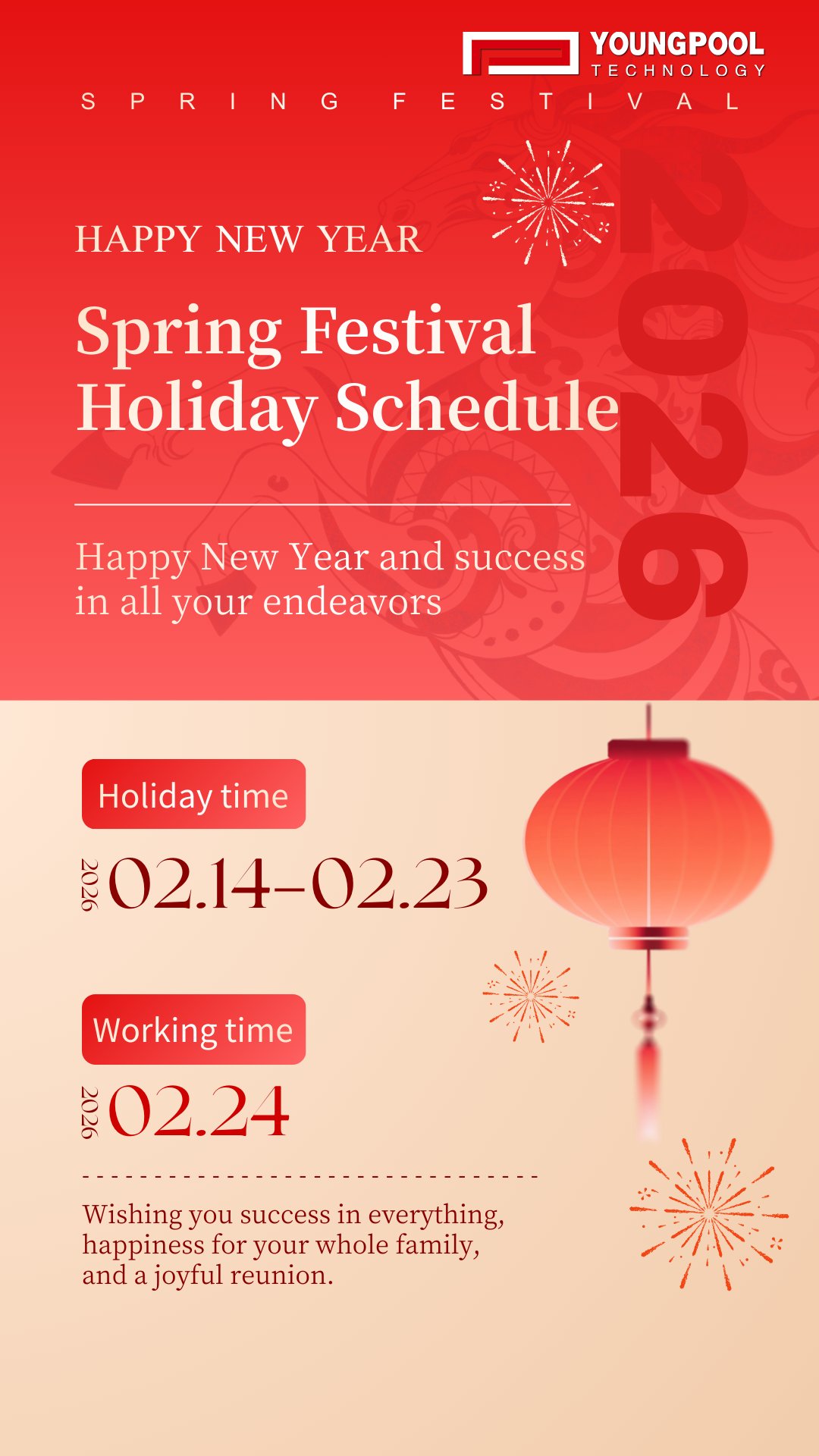 As spring gradually unfolds, Youngpool Technology will soon enter the Spring Festival holiday period. To facilitate advance planning for our customers and partners, our 2026 Spring Festival holiday schedule is announced as follows: