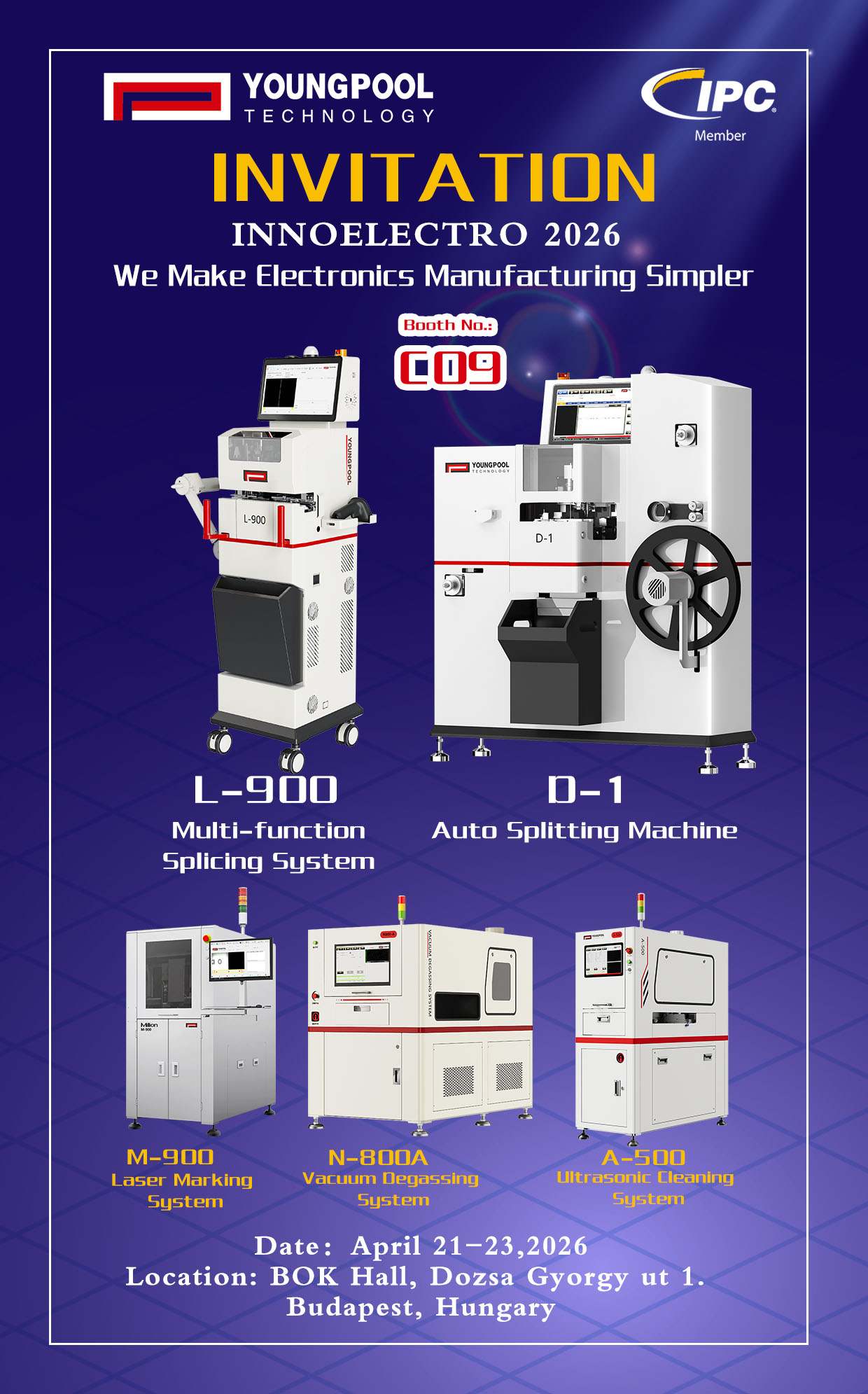 Youngpool Technology vous invite chaleureusement à visiter le stand C09 pour des échanges directs et explorer ensemble les perspectives d'avenir de la fabrication intelligente SMT. Nous serons ravis de vous rencontrer à Budapest, en Hongrie, et d'entamer ensemble une nouvelle ère pour une production électronique efficace, intelligente et fiable.